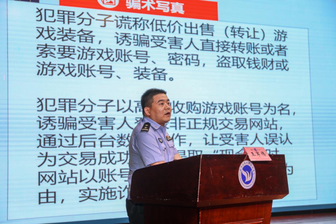 民警王军伟首先作防范电信网络诈骗专题宣讲。王警官系统梳理了电信网络诈骗的定义、常见类型及防范策略,结合高校发案特点,重点剖析了兼职刷单、游戏交易、冒充客服等高发诈骗手法。通过真实案例与防骗口诀,切实增强了师生识别诈骗、规避风险的能力。